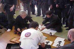 Hieronder zie je Soke Masaaki Hatsumi (de man met bril) die een training onderbreekt om te gaan schilderen.